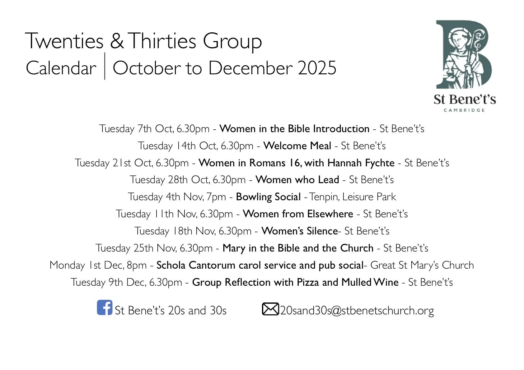 Students and other young adults at St Bene’t’s meet each week for social events, to share life together, and for Bible study and other reading. Newcomers and friends are always really welcome! Drop us a line at 20sand30s@stbenetschurch.org, and follow us on our Facebook group.